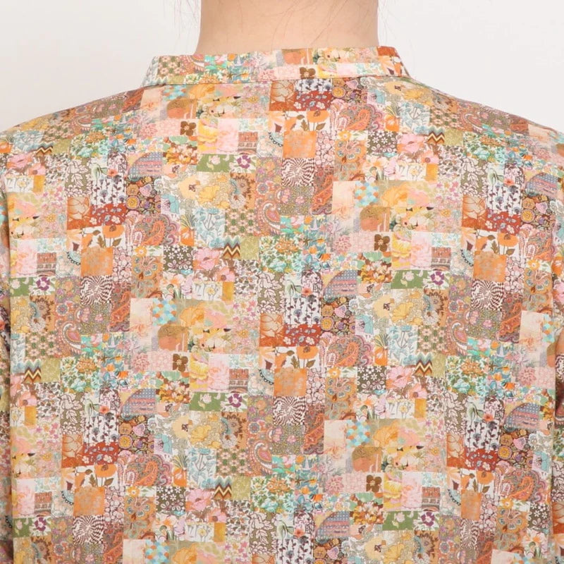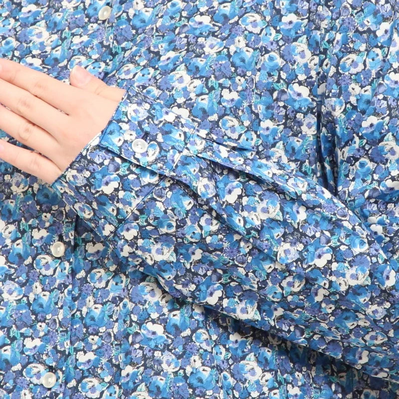 冬のはじまりにふさわしい、上品なLIBERTYプリントのフレアワンピース。すっきりとしたバンドカラーと柔らかな綿素材が、軽やかに季節を整えます。