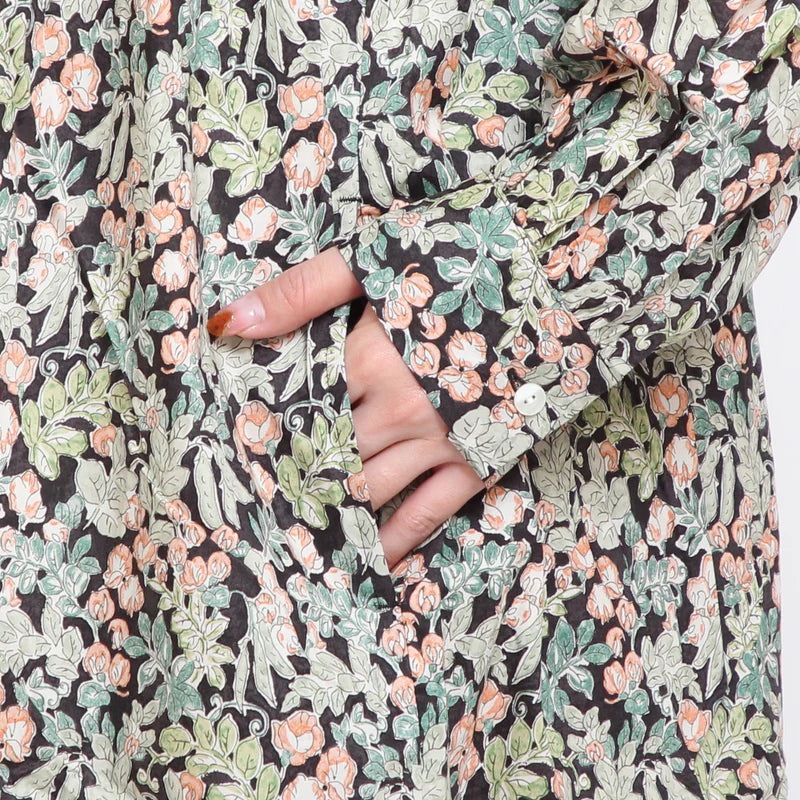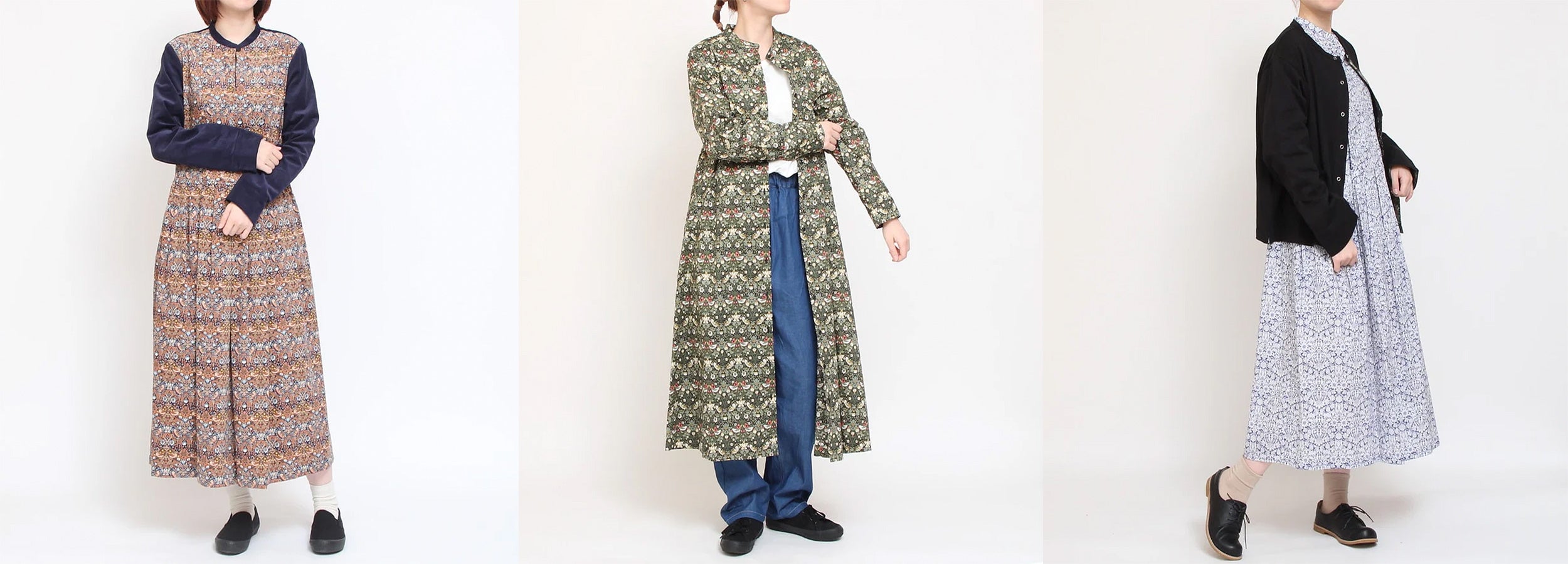 冬のはじまりをやさしく彩る、LIBERTYプリントのパイピングワンピース。マオカラーの襟元と三つボタンが上品な印象を添え、軽やかなシルエットが日常を整えます。