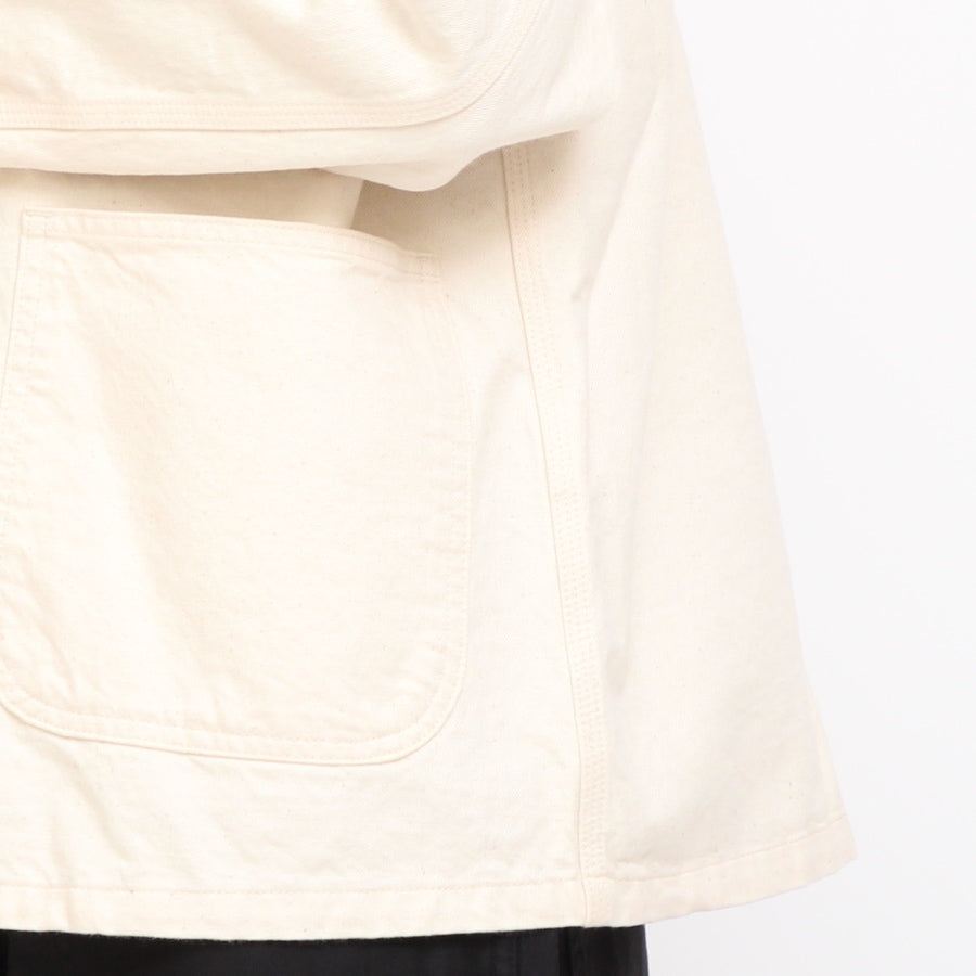 袖ぐりはゆとりのあるドロップショルダーでボクシーなシルエットのカバーオールです。