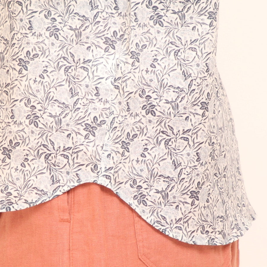 袖ぐりはセットイン。袖幅はリネンを使用ということもあり、そこまで窮屈感なくお召しいただけるゆとりをもっております。袖丈は7分袖。手首が出て女性らしい印象を作ってくれるだけでなく、小柄な方も袖丈を気にすることなく楽しんでいただけるので嬉しいポイントではないでしょうか。