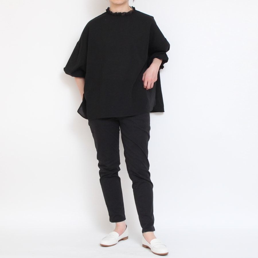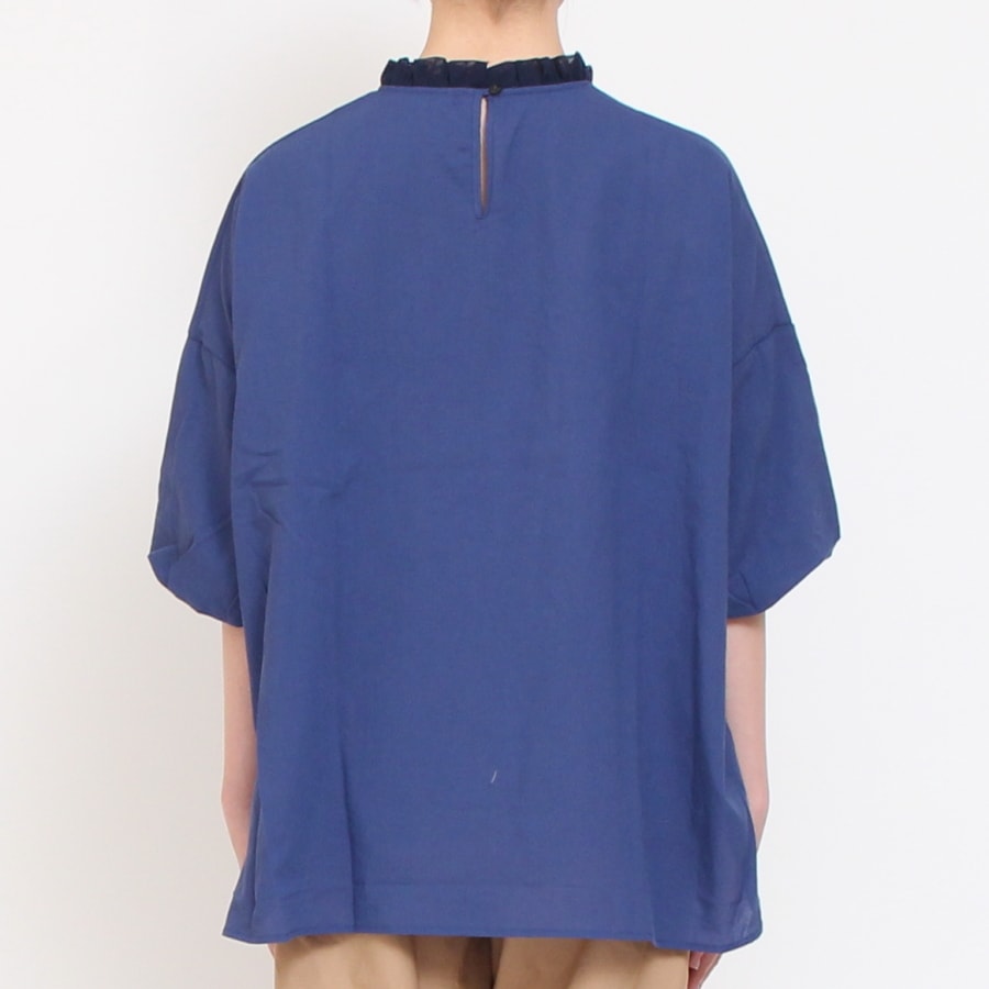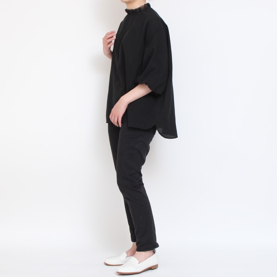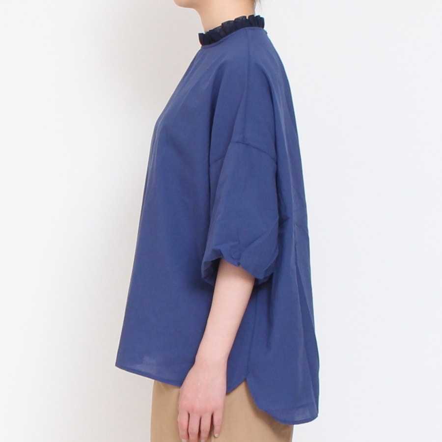 ふんわりとした肌触りとネックラインのチュールレースが程よいアクセントになった、かぶりタイプのブラウスです。