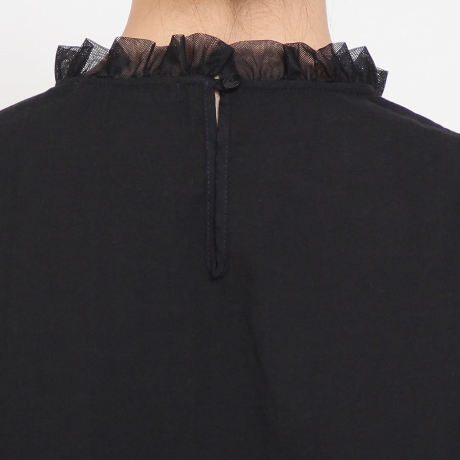襟ぐりは首元のチュールレースが上品な着こなしに仕上がるアクセントに。お顔周りを華やかに演出。チュール素材のフリルが程よいアクセントになっております。