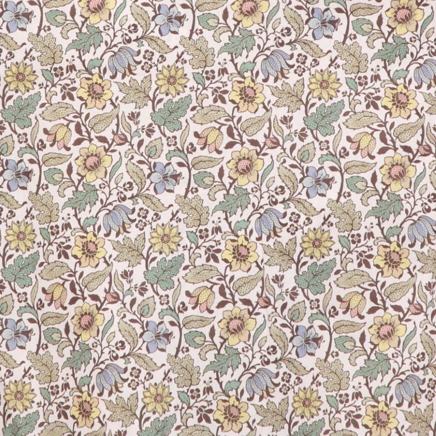 ジャコビアン・スタイルの花柄を彷彿とさせるこのボタニカルプリントは、リバティ・アーカイブにあったラージスケールの作品をベースに2020年秋冬コレクションのために作られました。アウトラインで描かれた花の連なりはオリジナルの手描きの質感を保っており、小さなドットがわずかな影の効果を与えています。
