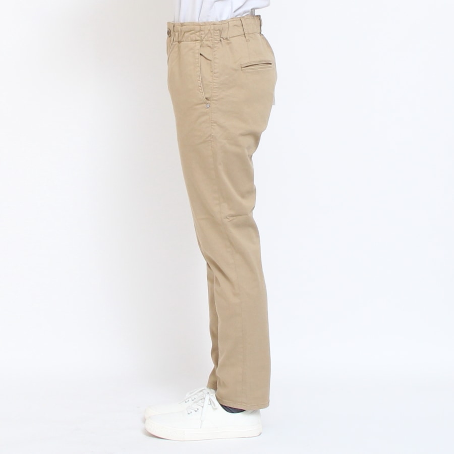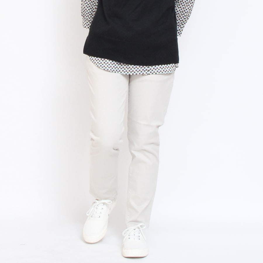 ISKO社のストレッチチノ素材を用いた、あらゆる動作の自由度を高めた生地感が特徴の素材です。しっかりとストレッチが効いた穿き心地が自慢で、質感と肌あたりも良いので自然と体に馴染んでくれます。仕上げの製品染めにてカラーをトッピングしカジュアルさを引き出しています。