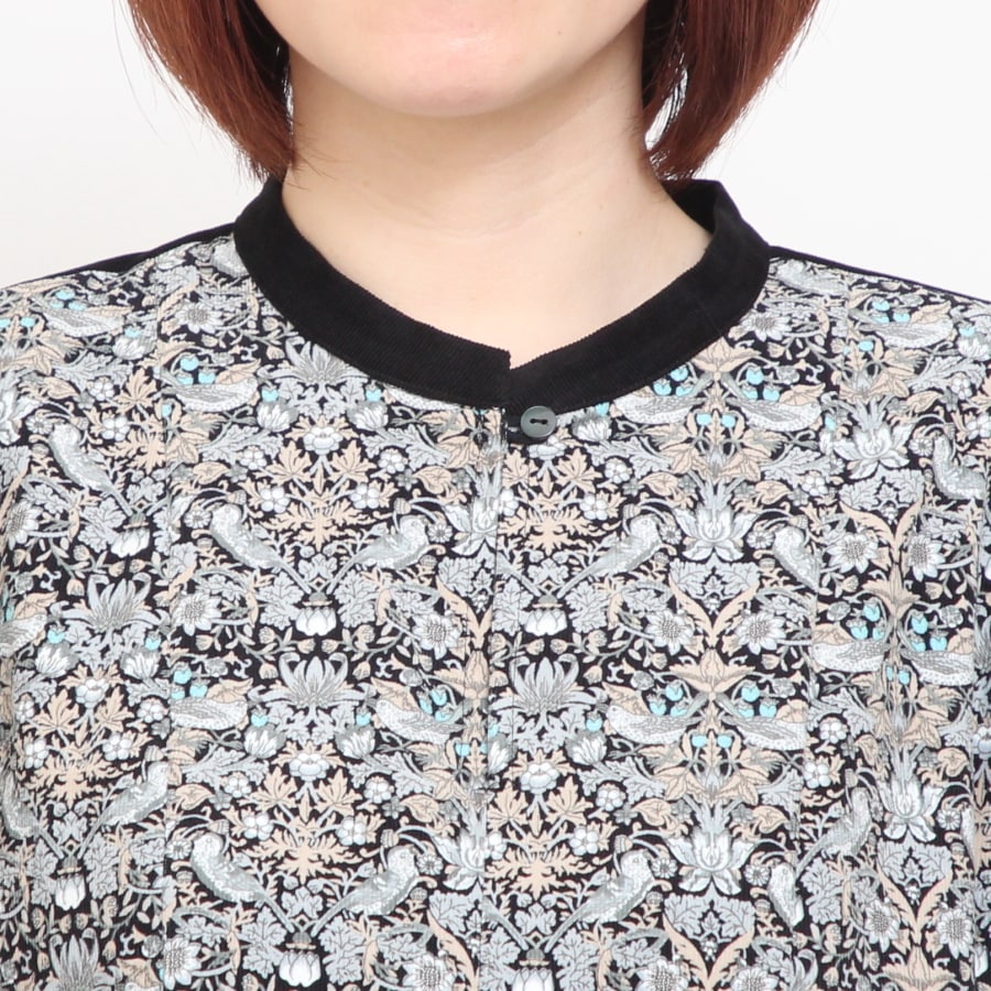 襟と袖、背中部分が無地切り替えになったワンピース。