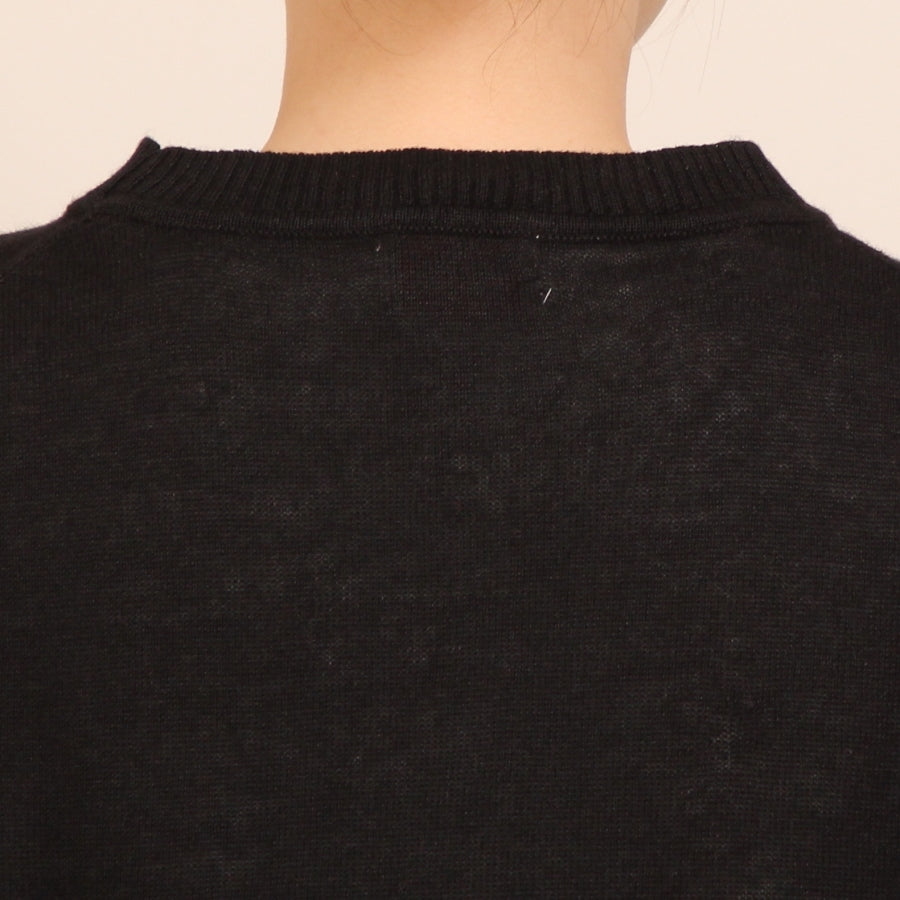 襟ぐりはリブ切り替えがアクセントになったクルーネック。