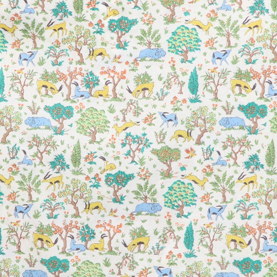 生い茂る木々や咲き誇る花々の中にライオンや鹿、