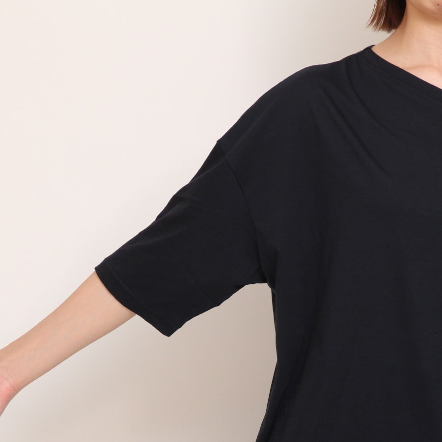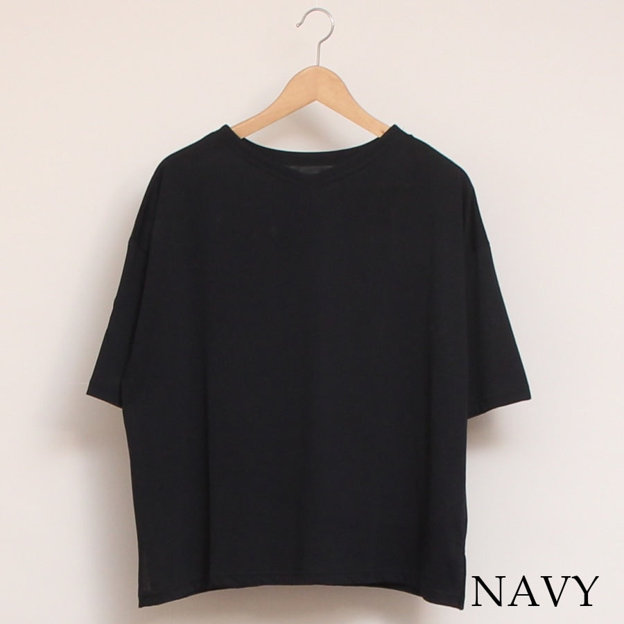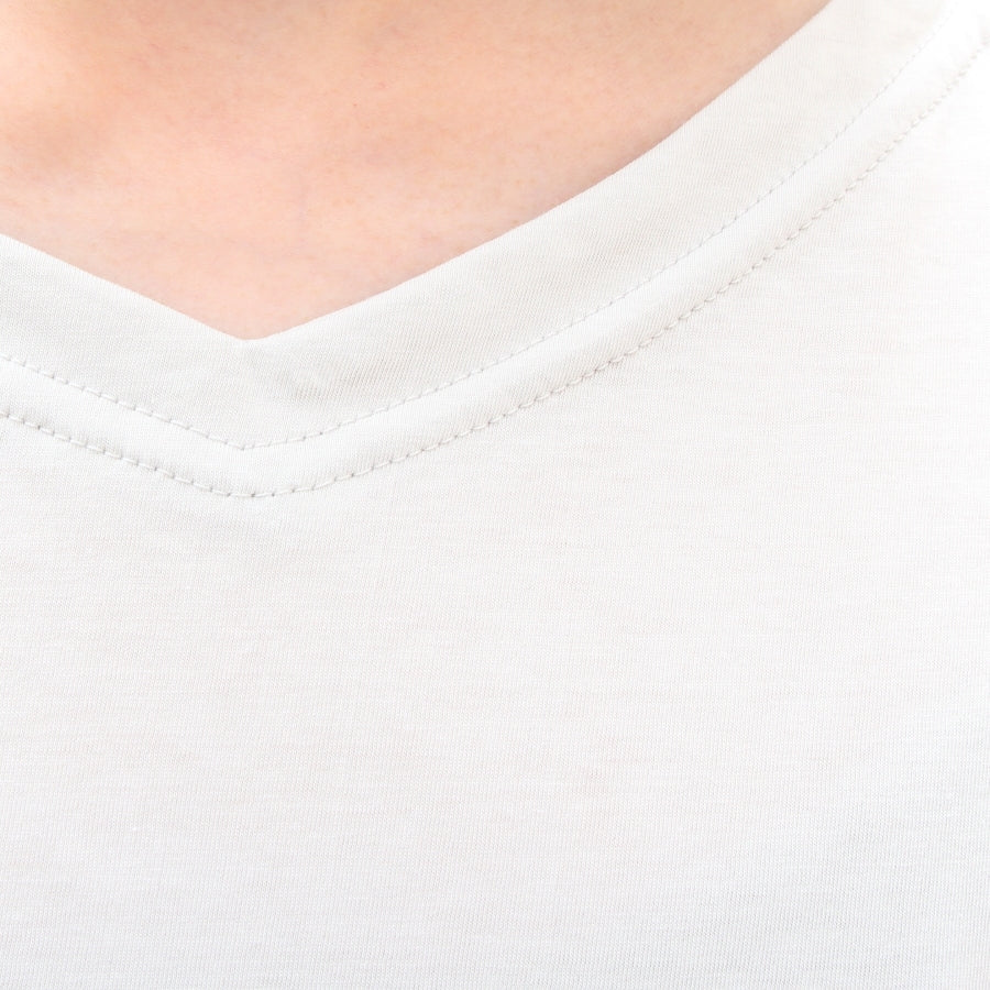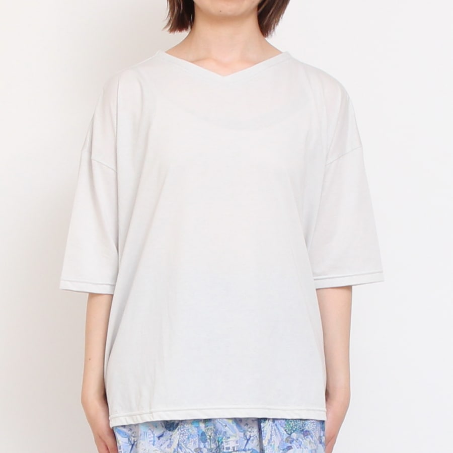 襟ぐりはすっきりとした印象のVネックと