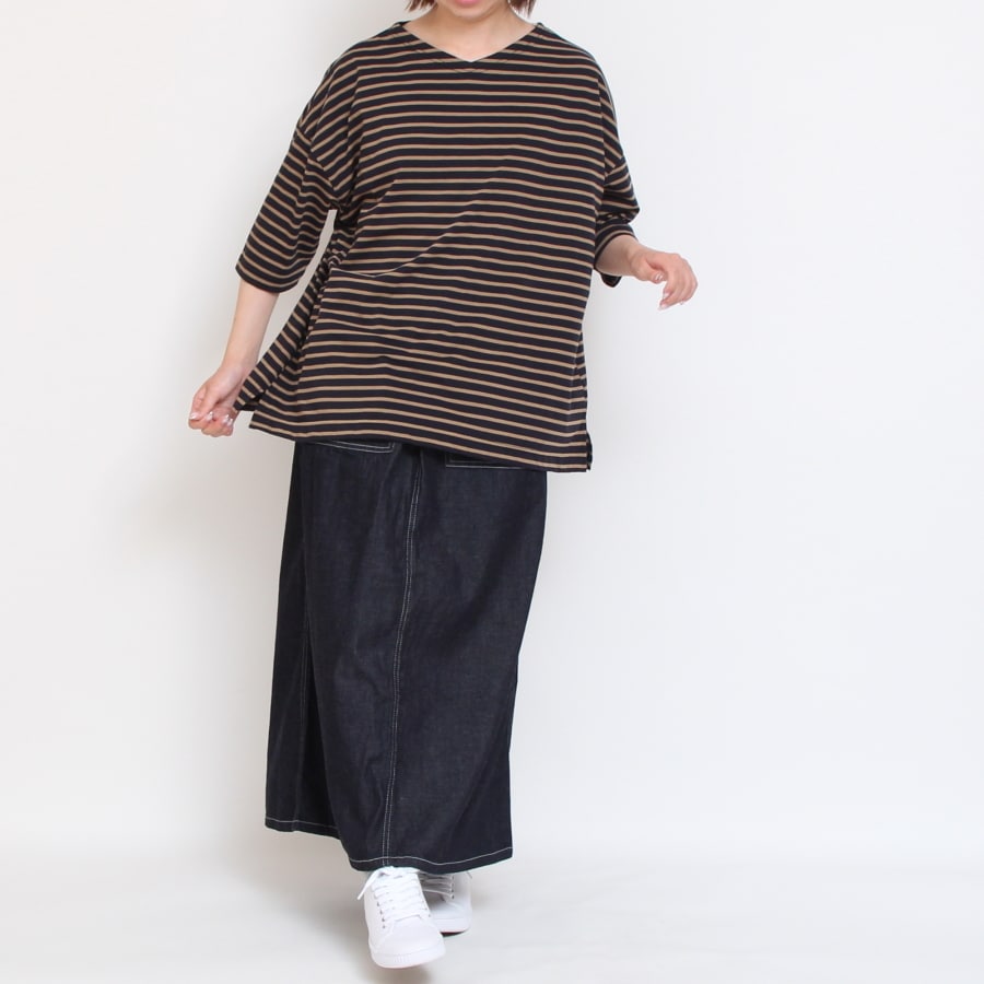 裾がストンとしてるので、スカートにインしてもキレイに着こなせます。