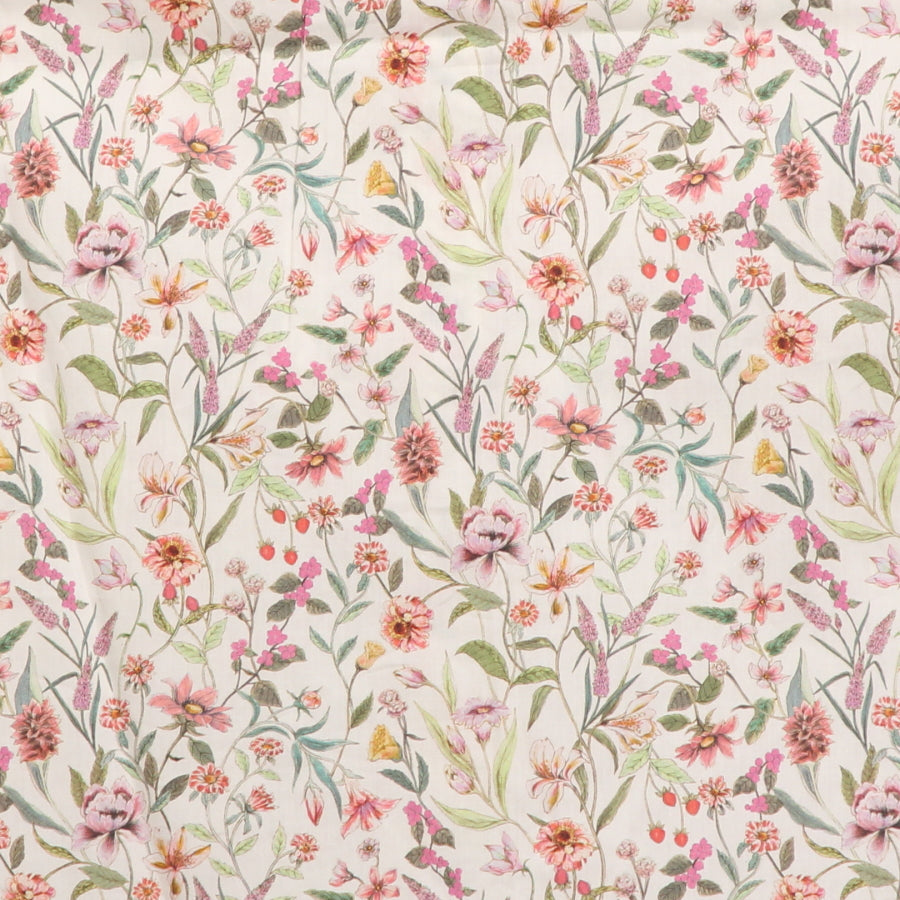 小さな葉とベリーの総柄は、新しいコレクションのために淡い色調で描き直され、